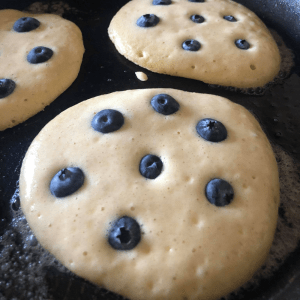 Pour a half ladle full of batter onto the frying pan and then scatter about 5 to 6 blueberries on top. Cook the bottom side for 2 to 3 minutes, until golden brown underneath and then flip, cooking the other side for a further 2 to 3 minutes.